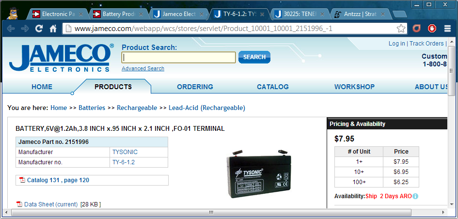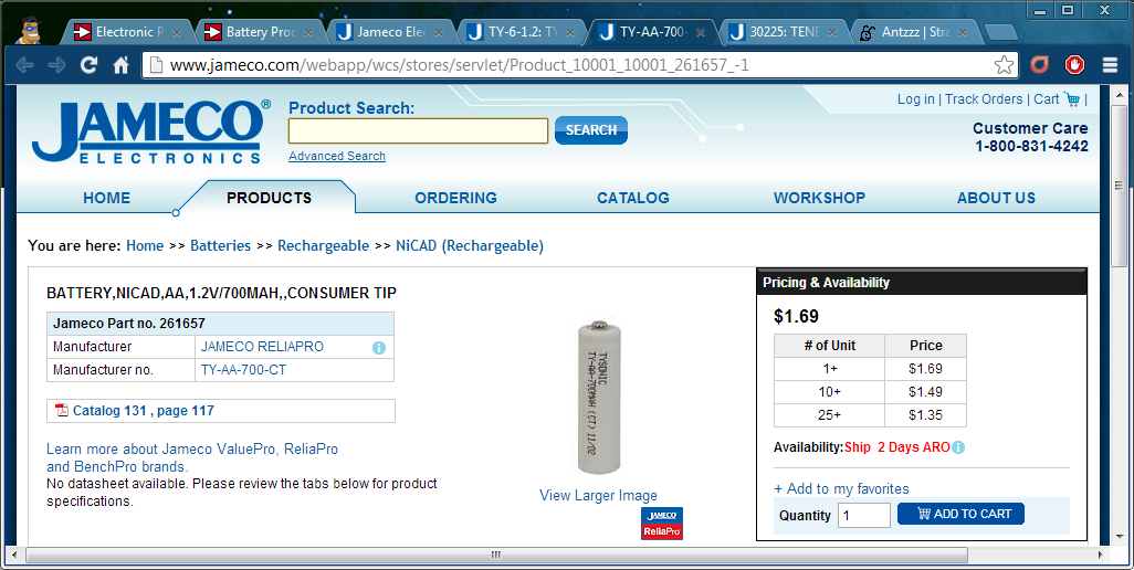 | LiFePO4 | AA Form Factor | 3.2V | 0.4 AH | Tenergy | Jameco | $2.25 | $1.95 for (10+) | http://www.jameco.com/webapp/wcs/stores/servlet/Product_10001_10001_2144227_-1 | |